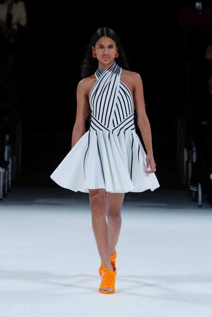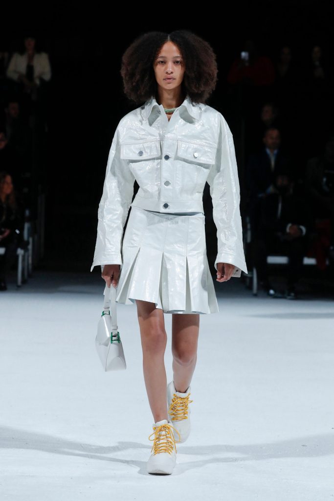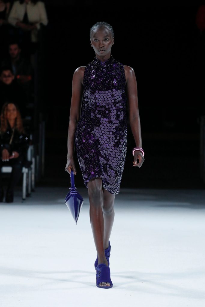 Editors, celebrities, and fashionistas flew to Motor City last night to see the brand’s Spring 22 collection. “Salon 03” was held at the Michigan Theater in Downtown Detroit, a building designed in 1926 that mixes French Renaissance style with an industrial vibe. To a techno soundtrack created by Moodymann and Carl Craig, models walked wearing clothing influenced by sportswear. The collection was a reinterpretation of classic American style. We saw garments like anoraks, parachute jackets, and in general, a very sporty aesthetic elevated by the brand’s elegance and expertise. Knitted dresses, sequins, and pleated skirts continued to be part of this collection, but this time Daniel Lee combined them with sporty shoes for a more casual vibe. We saw dresses in purple sequins, maxi coats in white faux fur, blouses with green sequins, neon orange bags, and white halter dresses with black accents. It was a collection that represents new luxury, in which elegance and comfort intertwine. Gone are the days when fashion can’t be comfortable…well, at least in the world of Bottega Veneta.