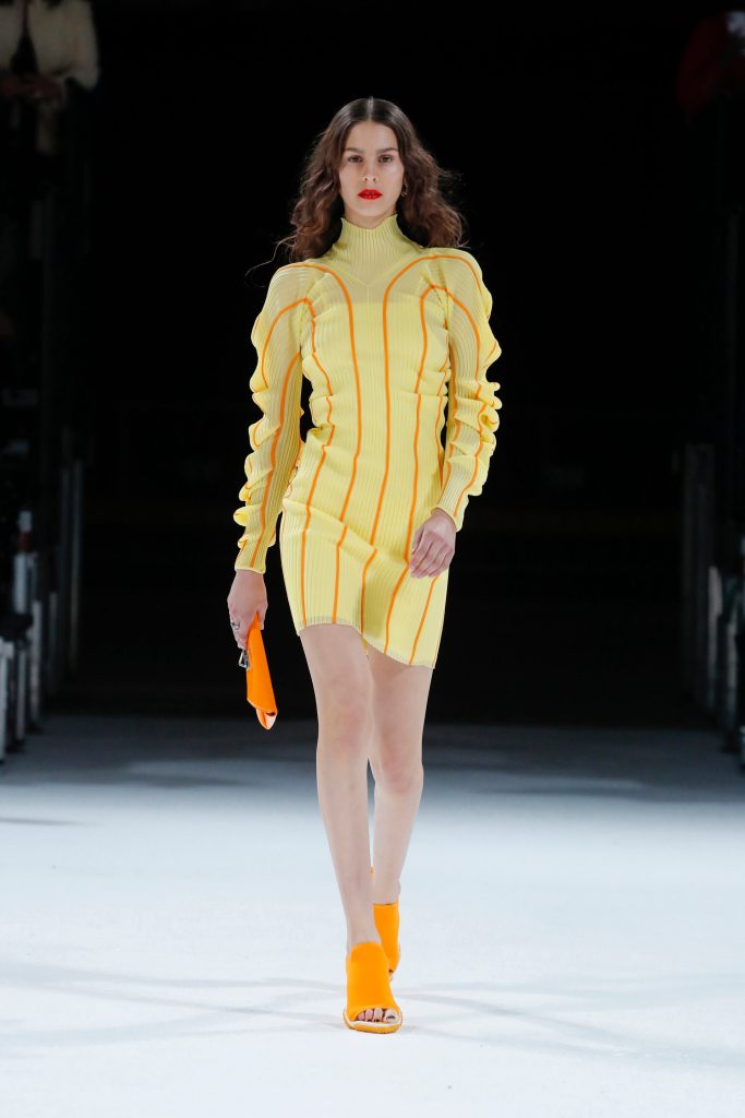 Among my favorite looks was an oversized navy-blue anorak inspired by sportswear combined with black mules; it was the perfect balance between streetwear and high-fashion. Another outfit that got my attention was the pale-yellow sequined dress paired with canary yellow rain boots and a parakeet green bag. I also loved the knitwear pieces, such as the yellow knee-length dress with orange accents and accessories to match and a total white look with a pleated dress with a fringe hem paired with sneakers and a shoulder bag with green details. The latter reminded me of tennis players at Wimbledon.