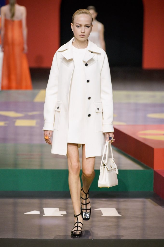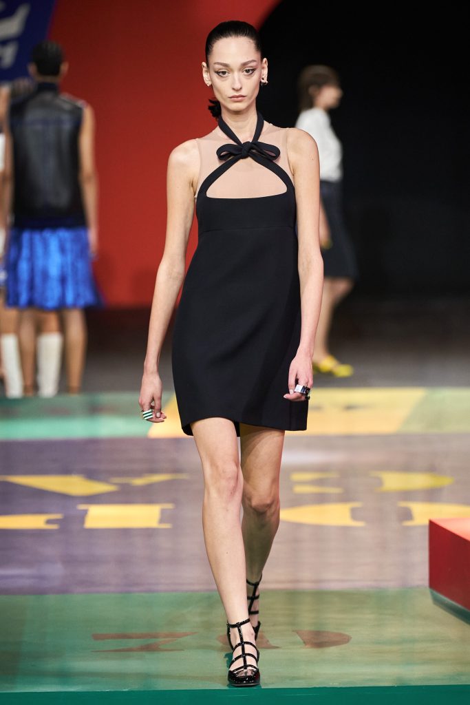 Dentro de mis looks favoritos están un conjunto de shorts y chaqueta ajustada con cinturón en un tono naranja muy luminoso así como un vestido con silueta en A en un verde potente, me fascinó que los zapatos estaban en el mismo tono y un abrigo muy en la onda sixties en amarillo eléctrico a juego con unos mary janes en charol negro. Otro de mis top looks fue un little black dress con un detalle de lazo en el escote, me recordó a una Audrey Hepburn moderna y muy chic. También me encantó un gown blanco con detalle de mesh natural en el escote y lazos en los costados, una estética muy naïf que contrastaba con otro de mis favoritos: un vestido de mesh natural con top de banda y mini falda con print de un leopardo en tono verde fosfo y zanahoria.