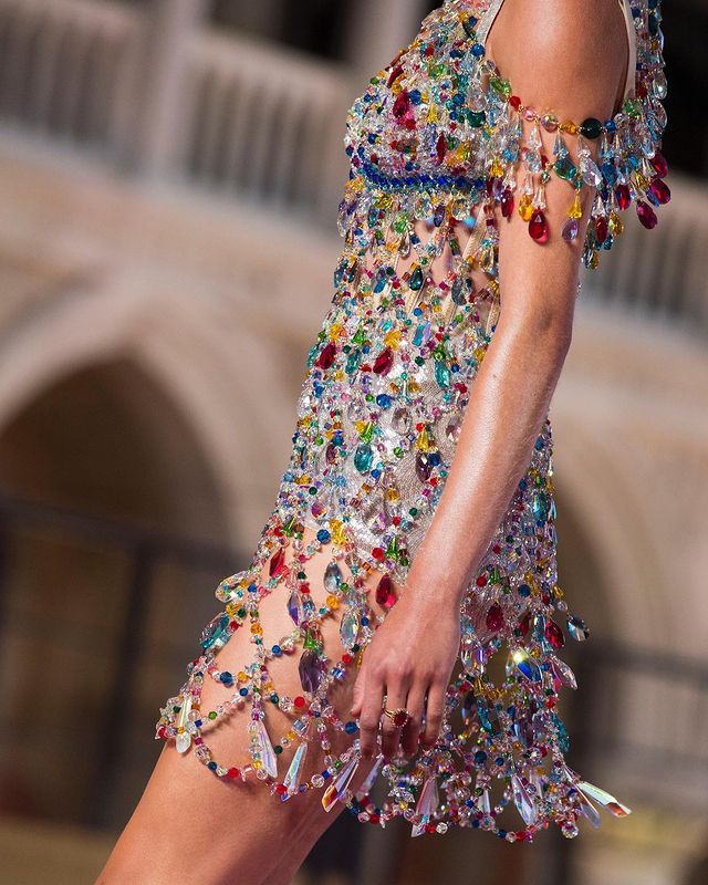 The collection was an explosion of Italian elements inspired by Venice. The tulle and silk crepe dresses with embroidered crystals resembled beautiful Murano stained glass, while satin garments nodded to the brilliance of the sun’s reflections on the city’s canals. Exuberance and opulence–recurring elements in all Dolce & Gabbana collections–once defined the aesthetic of Italian romanticism and elegance and now remind us of the mythical and legendary carnivals Venice. This collection is essential to the legacy of the brand.