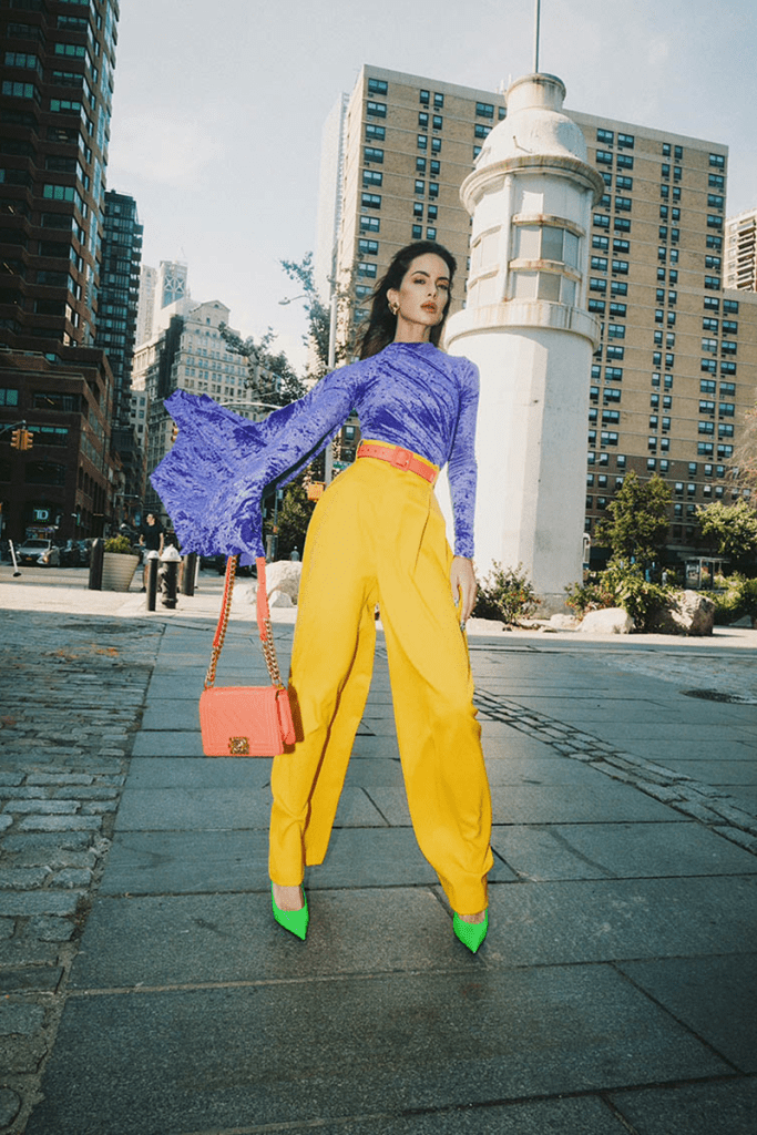 Mi primer look no por ser cómodo debía de ser aburrido, así que elegí piezas en tonalidades vibrantes que resaltan contra la Jungla de Concreto de Manhattan. Combiné una blusa en tono iris de Balenciaga con un pantalón high waisted en amarillo oro de Bottega Veneta, para completar el look decidí llevar una clásica bolsa Boy de charol en color durazno pastel de Chanel, un par de pumps en verde neón eléctrico y un cinturón en durazno neón de Saint Laurent. Este atuendo es perfecto para el día, y además muy adecuado para robar las cámaras de los fotógrafos al salir de una pasarela o mientras vas caminando a la próxima cita en algún showroom.