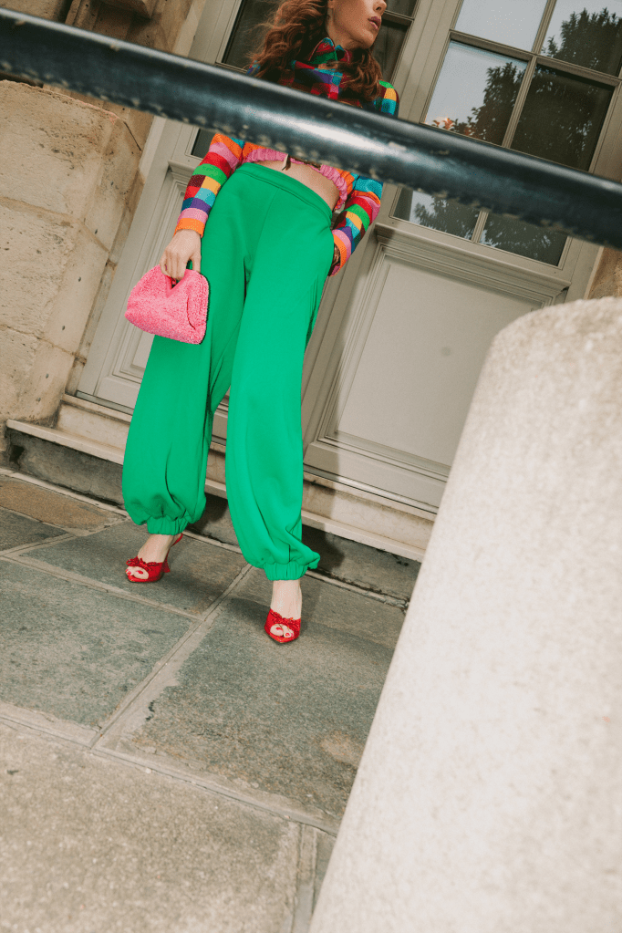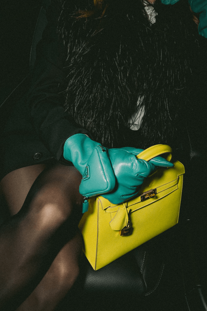 Without a doubt, this is one of the trends that I love the most this season. I love how I can combine my cosmetics, like lipstick and nail polish, with a Bulgari Serpenti Forever bag in red for the perfect match. I love playing with different shades and creating contrasts in a look, like I did when I combined my Bottega Veneta pouch in amethyst with a red dress and sweater in canary. I also like creating gradients, like total black look combined with a yellow Hermès Kelly bag and pistachio green Prada gloves.