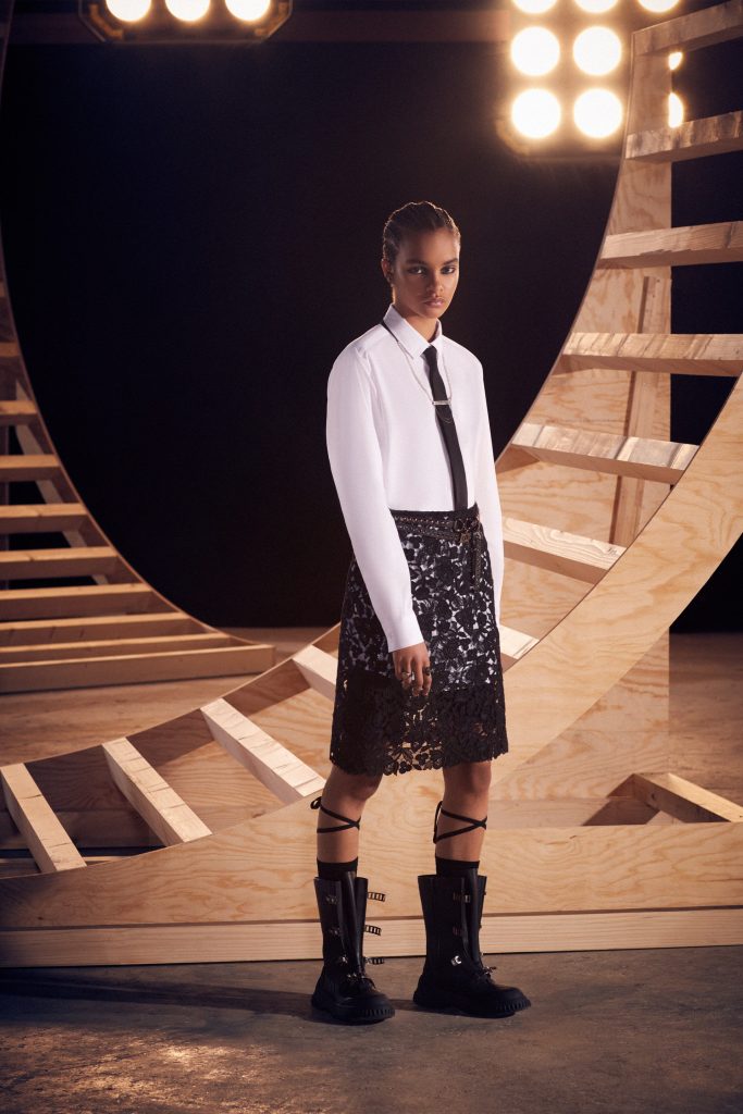 Bajo su visión los uniformes clásicos se transforman en piezas modernas para la colección de Dior Fall 22. El estampado a cuadros da paso a un print tartán de influencia británica con más rebeldía, elementos punk se hacen presentes en la forma de tul y encaje negro que crean transparencias y prendas de cuero o puffer jackets otorgan un vibe más irreverente y desenfadado a la colección. Vemos claras referencias a los uniformes escolares pero reinterpretados para una generación más chic and cool. Encontramos mini vestidos de mesh en textiles metalizados en un tono rosa iridiscente con dobladillo sin terminar que se pueden usar sobre una camisa blanca y una falda, así como un bralette and shorts. La clásica falda plisada del colegio se impregna de un estampado tartán amarillo con escudo de armas de la firma y se combina con un suéter de mohair con silueta oversize. Todos elementos característicos del estilo preppy americano pero diseñados bajo la visión irreverente y rebelde de la estética punk londinense con un toque de elegancia parisina.
