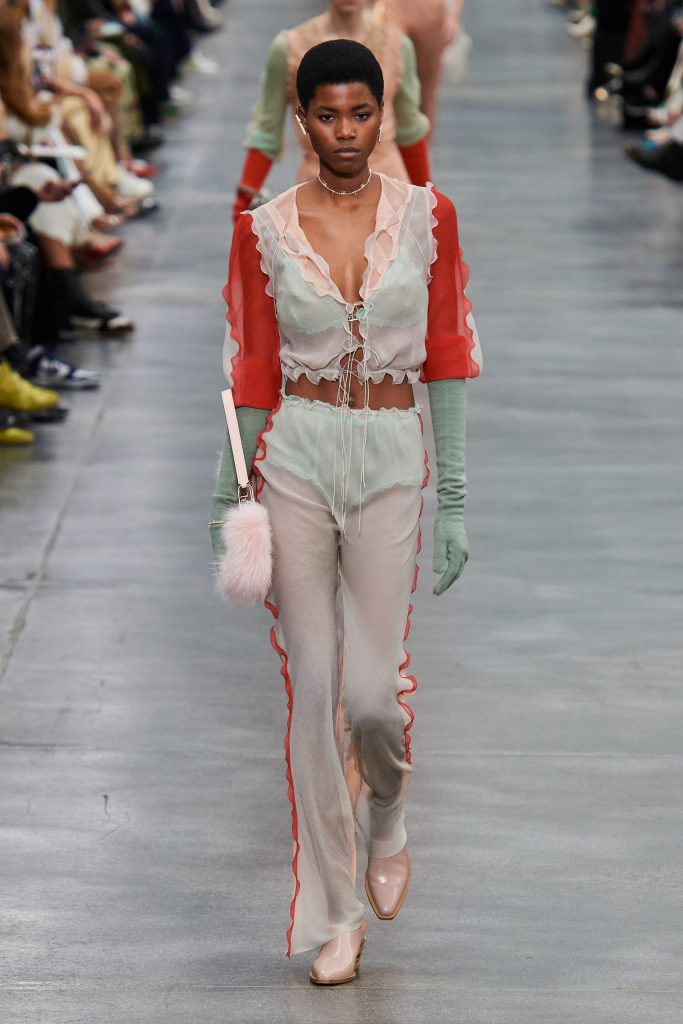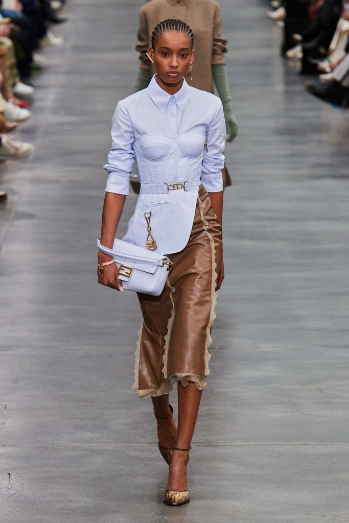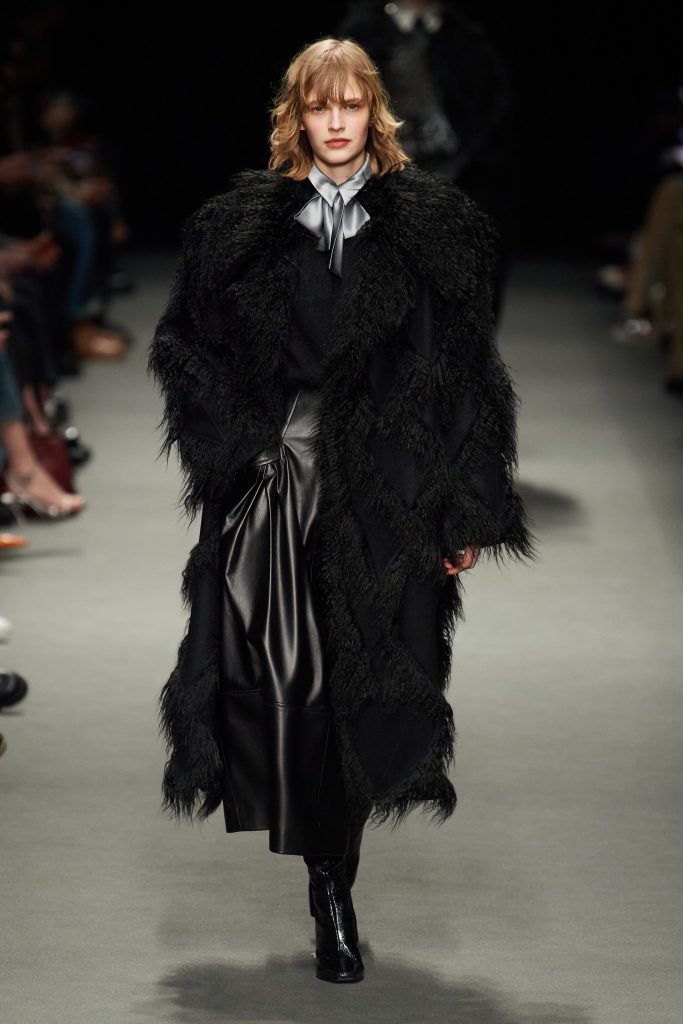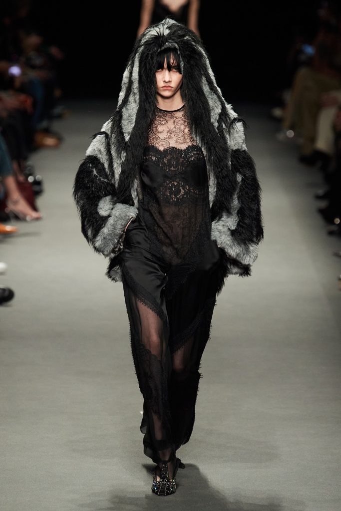 Vimos como las prendas de mohair and shearling se convierten en segundas pieles para la modelo, abrigos en estos suntuosos materiales cubren atuendos de chiffon de seda en capas casi transparentes que dejan ver el bello cuerpo de la mujer. Looks en los que la masculinidad colisiona con la feminidad, como los trajes donde los sacos se cortan en el ombligo, o camisas blancas de algodón metidas debajo de los rompers con corsé. Estilismos que combinaron corsé de cuero con jeans de pierna ancha o boleros en fur con vestidos lencero de seda transparente con guantes de cachemira. Cada atuendo de la pasarela estuvo envuelto en una dualidad, justo a medio camino entre lo femenino y lo masculino.