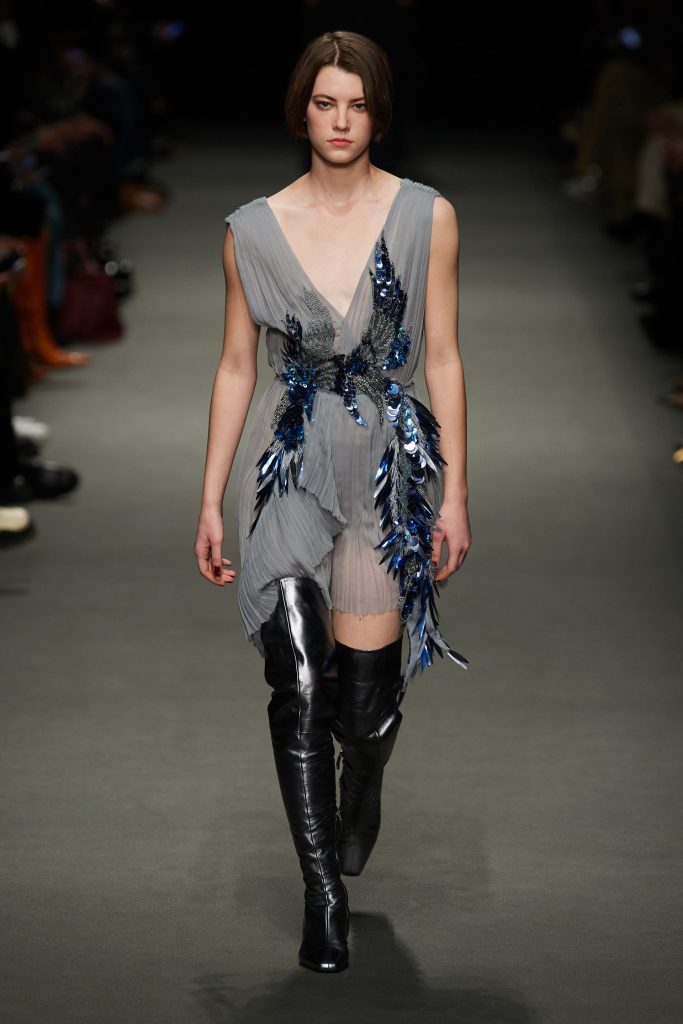 Desde el primer look – una chamarra de cuero con forro de fur sobre un jersey de punto en tonos plateados combinado con un pantalón de lana y un sombrero de ala ancha – que vimos en la pasarela podemos ver ese espíritu de fortaleza envuelto en un aire de feminidad, esta mujer es todo un personaje moderno. Envuelto en un aire de misterio cada uno de los atuendos que continuaron nos fueron contando una historia de una nueva feminidad; en donde la ropa se convierte en armaduras. La colección estuvo llena de elementos que transforman la ropa en un verdadero deleite al tacto, encontramos paillettes, encaje, fur, seda, satén, lana, plumas y cuero, todos textiles que convierten la experiencia de vestirse en un placer sensorial. Una colección llena de opulencia, pero sin caer en la exageración y obviedad. Alberta Ferretti nos presentó prendas atemporales que logran capturar el espíritu de nuestra sociedad actual. Donde buscamos pequeños placeres en nuestra vida cotidiana, llenar nuestro día a día de elementos que nos provocan felicidad.