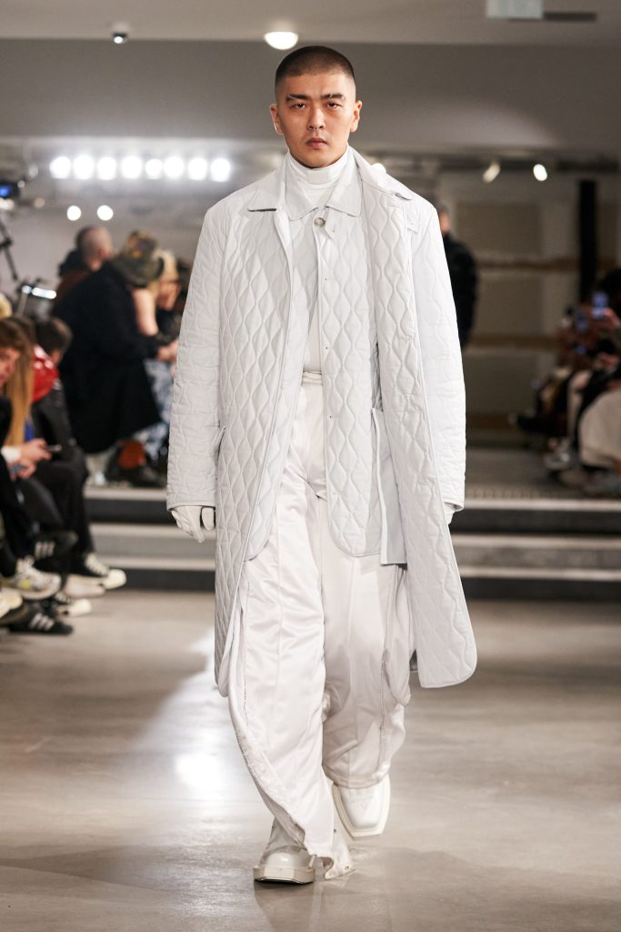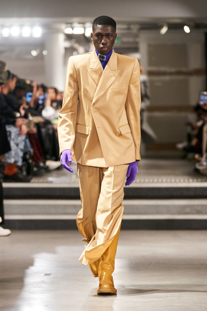Despite being a separate brand from Vetements, VTMNTS continues to possess certain elements of the original brand’s celebrated DNA. In this new design universe, all garments are genderless, a concept that is becoming more of a status quo than a trend. The younger generations, to whom this firm speaks, do not see gender in clothing and that gives us a beautiful and original visual aesthetic. But unlike Vetements, at VTMNTS we see more grounded garments, mega oversized silhouettes shrunk to create more functional garments. We moved away a bit from the universe of hoodies and t-shirts, to enter the world of the masculine sartorial. We saw two-piece suits with XL shoulder pads that framed male and female silhouettes, distorting the human figure a bit. We saw wool coats in different shades – royal blue, clay, gray, and black – and quilted trench coats, a clear influence from Savile Row creations but with a modern take.
