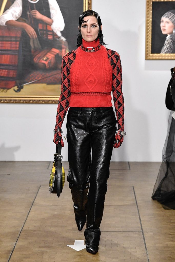 Plaid print cape coats hide pink cashmere turtlenecks and wool mini skirts paired with gray cashmere gloves and neon green knee-high boots. It’s an image that speaks to us of a retro and futuristic aesthetic at the same time. This is how Nina Ricci’s outfits ax|re, a clear inspiration in the 60s, the feeling of freedom and happiness of the time returns in each piece in the collection. But it’s not just a collection that borrows its aesthetic from a bygone era. It has managed to capture the spirit of a decade and bring it into 2022. We saw a mini skirt in red patent leather paired with a caped puffer jacket at the same fiery tone and contrast with vibrant yellow boots, to finish off the look a pair of oversize PVC sunglasses—as if out of a Sci-Fi movie. Modernist and playful is how I would describe each of Nina Ricci’s new creations.