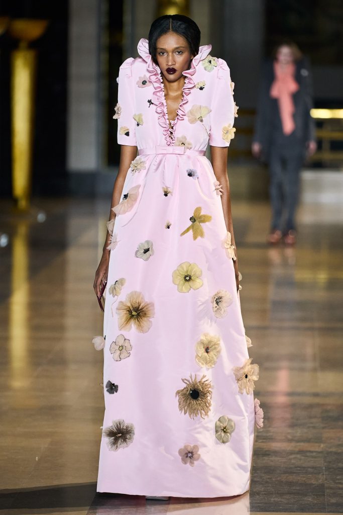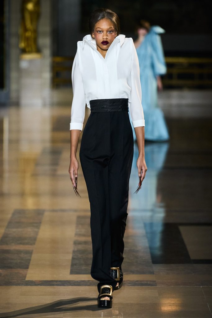 Cada uno de los looks de la colección Spring 2022 Couture posee un aura enigmática que llama la atención. Un río de atuendos en donde el blanco y el negro sirvieron como base con algunos acentos de tonalidades pastel. Preciosas prendas como el vestido malva con escote pronunciado en pico y detalle de lazo XL en la cintura o la clásica combinación de camisa blanca con hombros elevados y pantalón de esmoquin negro. Otro momento sensacional fue el vestido plisado largo hasta el suelo en baby blue iridiscente con un cuello de flor XL. Cada uno impresionante tanto en diseño como en hechura.