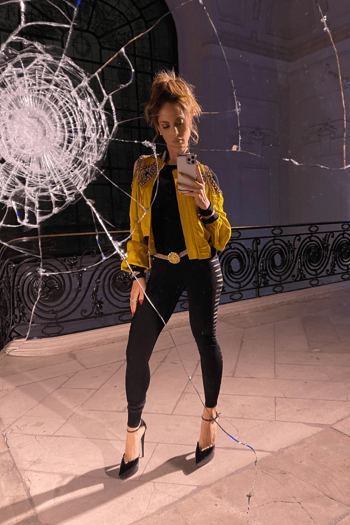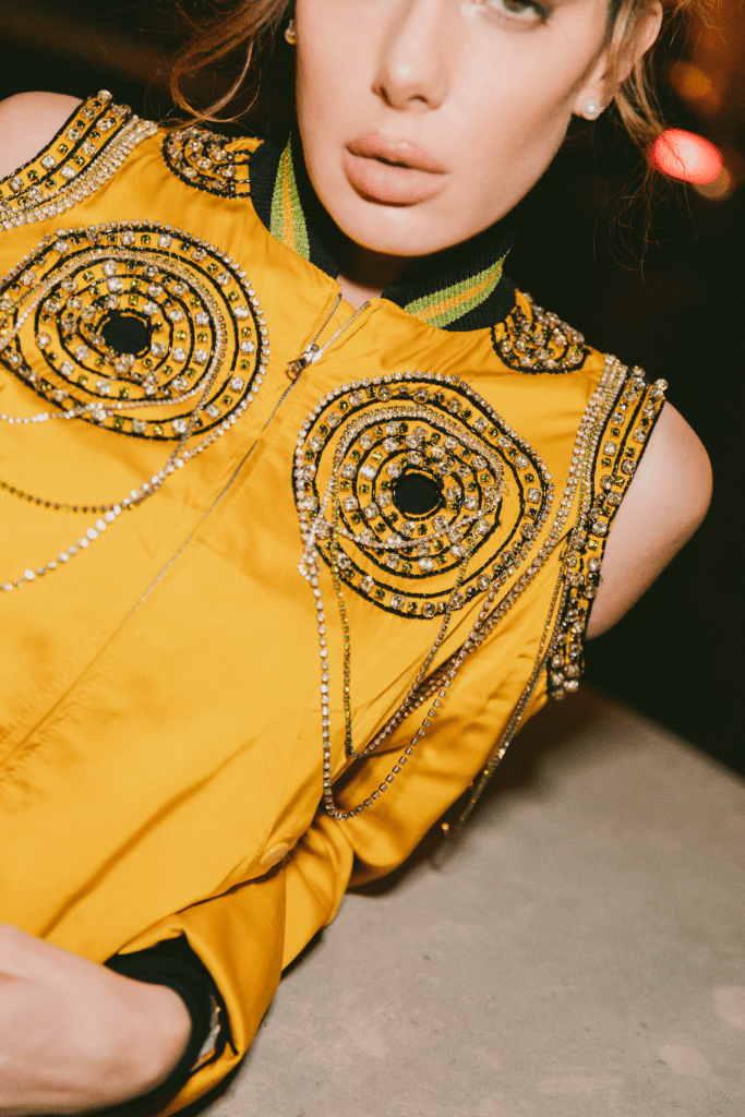 Para esta enigmática noche decidí optar por un atuendo con inspiración sporty pero con un twist lleno de sensualidad y atrevimiento. Mi look consistía en una bomber jacket de Jean Paul Gaultier en tono amarillo miel metalizado con cristales bordados, cut-outs en los hombros y acentos de color negro y verde en el cuello, puños y cintura. Combine esta pieza statement con un mono en color negro y cut-outs en los costados de las piernas, unos pumps con pulsera de tacón alto en cuero negro y el cinturón Sun Chain en metal con rhinestones, todo de Saint Laurent. Con este outfit quise crear un balance perfecto entre el sportswear vibe de la chamarra con la sensualidad del jumpsuit y los high-heels, para sentirme como pez en el agua con el espíritu sexy que representa Jean Paul Gaultier.