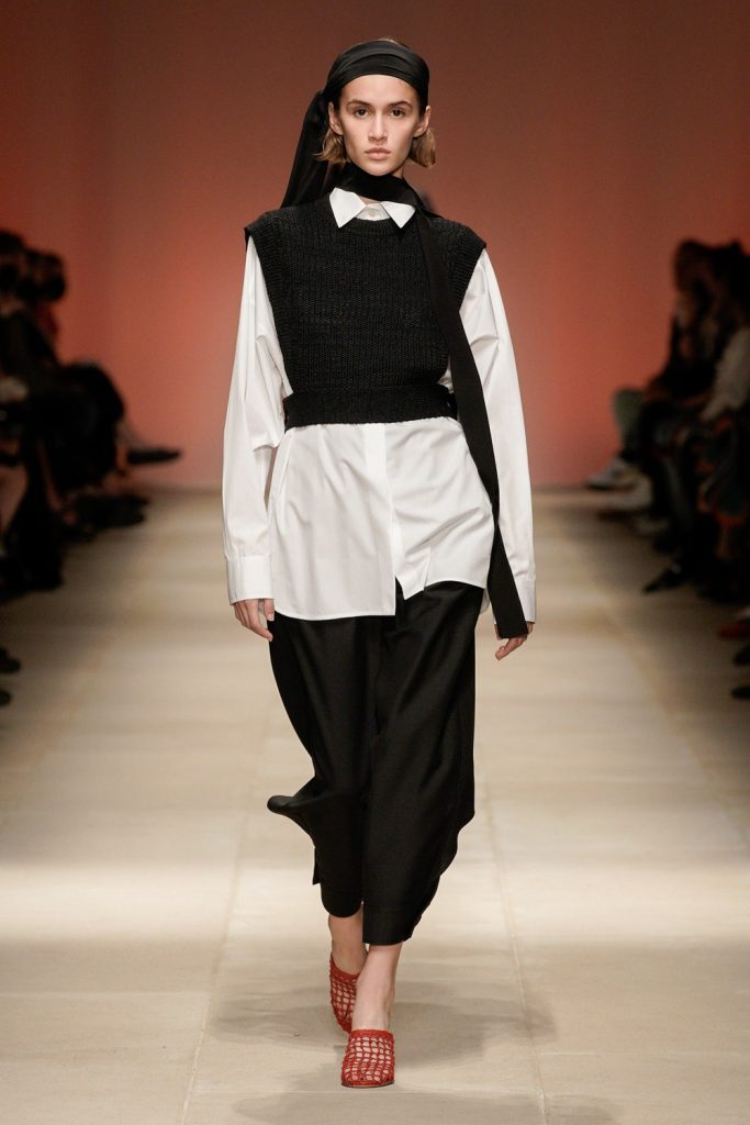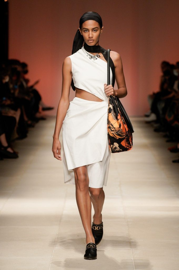Me encanto la estética de cada uno de los outfits que desfilaron, ese glamour hollywoodense que tanto ha caracterizado a la firma. Por ejemplo, vemos una versión modernizada de Jacqueline Kennedy en el look que combina una prenda negra tejida de manga larga con cuello de cisne con un palazzo blanco, para completar el atuendo Ferragamo propone llevar una mascada a manera de turbante, una bolsa de mano con asa en tono miel, un collar con aires tribales y un par de mules con fishnet en color negro. ¡Amo este look clásico! Otro de los que más llamaron mi atención fue el atuendo en donde combinaron un top de rejilla en color negro con una falda vaporosa en seda nude y unos zapatos que son una amalgama entre el icónico mocasín de la firma con unos zuecos. Este atuendo logra un estilismo perfecto lleno de sensualidad refinada.