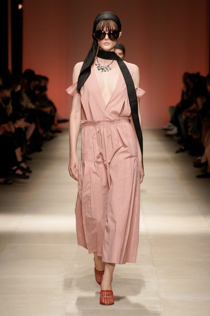 El espíritu de la bella Italia se plasma en la ropa a través de la paleta de color. Vemos como tonos neutros como el blanco y el negro se entremezcla con colores terracota y cafés para después dar paso a rosas, azules y amarillos. Conjuntos tejidos en rosa pálido y naranja vibrante desfilaron a lado de gabardinas celestes y prendas de cuero mostaza. La colección parece ser un hermoso atardecer en la campiña italiana, donde el cielo se entremezcla con la tierra. Una visión excepcional que encaja a la perfección en el mundo de Ferragamo, pues todo el espíritu de Italia es parte del ADN de Ferragamo al igual que Ferragamo es parte de la historia del país.