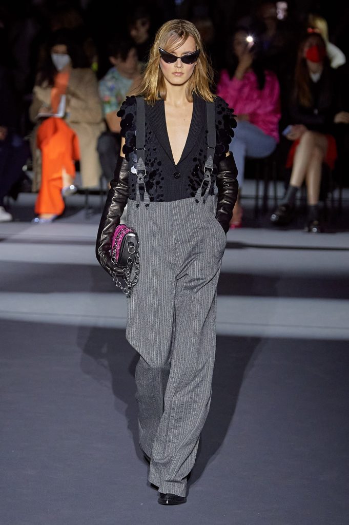 Durante este desfile pudimos presenciar looks que combinan piezas lenceras con suéteres de lana, bralettes por debajo de chalecos y vestidos tipo camisón. También micro shorts de mezclilla a juego con sacos tipo esmoquin así como faldas y espectaculares vestidos creados en su totalidad por cadenas de strass entretejidas, estos looks se completan con boas de plumas simulando una estética de muy de cabaret parisino. Las camisas a rayas y los broches de camelias son claro ejemplo de su inspiración en la Ciudad de la Luz.