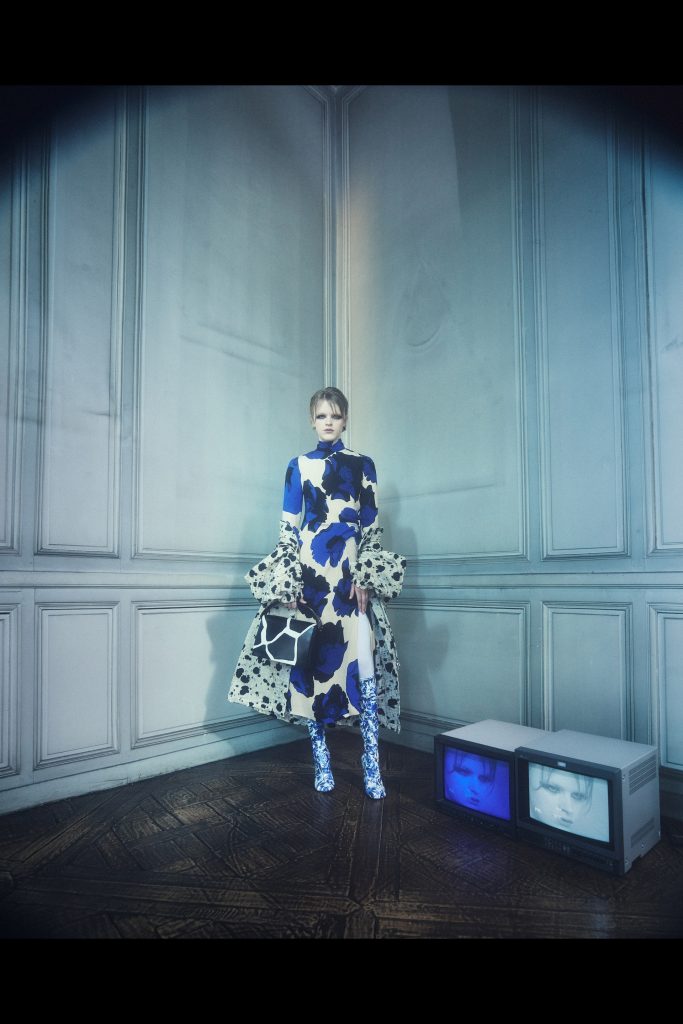 Para presentar su colección Fall 22 el diseñador optó por un video filme y una presentación que más que un one-one meeting fuera un tipo de exposición de arte durante Paris Fashion Week. Eligiendo una antigua casa histórica en París como locación – que le recuerda a su propio hogar al diseñador gracias a los tapices, iluminación y colores – donde cada uno de los asistentes es invitado a deambular por los cuartos y pasillos mientras van encontrando en los rincones de la casa los atuendos que conforman su nueva colección. En cada vuelta puedes apreciar algún vestido, traje de dos piezas o abrigo, y escondidos entre los muebles hay accesorios como bolsas, zapatos y joyería. La casa se convierte en un actor de la misma presentación, uno que guarda en su interior tesoros y secretos. Acompañando esta experiencia inmersiva, el diseñador creó un fashion film del behind the scenes de la creación del lookbook de la colección. Durante este mini clip Dries van Noten nos cuenta de la inspiración, de su proceso creativo y lo que quiere expresar, mientras vemos como la colección va tomando forma. El creativo belga nos dice que en su mente tenía la canción Luna Diamante de la cantante italiana Mina, una canción cuya melodía es hermosa pero que está llena de melancolía. Y es que creo que esta colección encarna este sentimiento, de algo bello que nace en un momento de tristeza.
