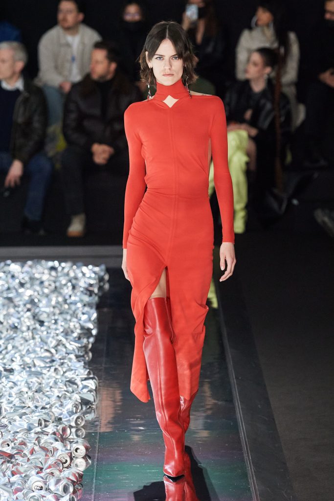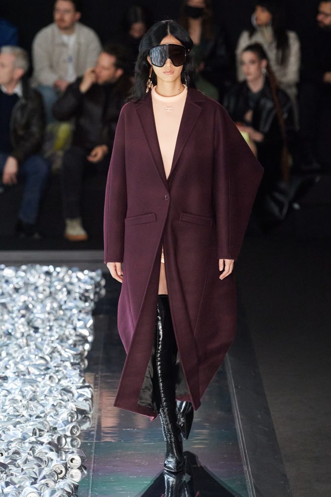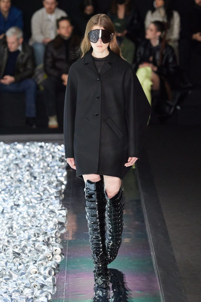 Las prendas insignia de la marca, como las mini faldas en piel burgundy, las crop jackets de vinilo negro o los mini vestidos de cuero negro, convivieron con nuevos diseños. Cómo pantalones de pierna ancha de PVC, abrigos línea A blancos o bodys con cut-outs. Cada una de estas prendas de vestir juntas crean una estética espacial que nos recuerda a las películas de sci-fi como Barbarella (1968), El quinto elemento (1997) o Matrix (1999). Courrèges sigue demostrando que su mirada está puesta hacia el mañana, con diseños vanguardistas que irónicamente poseen una estética retro y futurística a la vez. Una pasarela en la que los looks parecen provenir de un futuro – no tan distante – pero que al mismo tiempo podemos llevar en la calle hoy mismo.