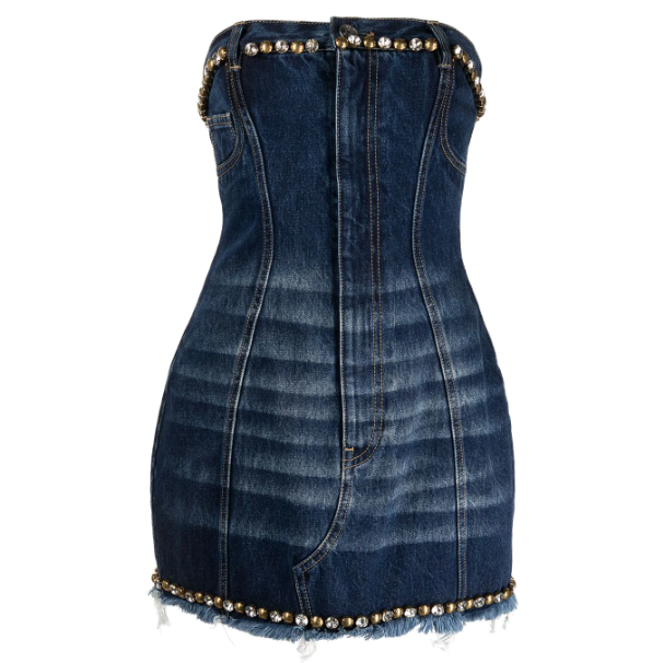 Una de las cosas que más disfruto es armar looks que marquen la diferencia, aunque no todo el mundo logre entenderlos. Crear un estilo propio requiere de mucha audacia y de saber defender la estética propia a golpe de outfits memorables y auténticos. Entre mis prendas favoritas están aquellas que son cómodas pero dueñas de acentos que hacen voltear todas las miradas, se convierten en temas de conversación y son un gancho infalible para lograr muchos likes. Entre mis favoritos para esta entrega de mi Shopping Cart encontramos desde piezas en clásico denim como los jeans de Magda Butrym con detalles en el dobladillo de plumas o un mini vestido strapless de Area con detalles de studs metálicos. ¿Qué mejor manera de darle la vuelta a un básico como la mezclilla?