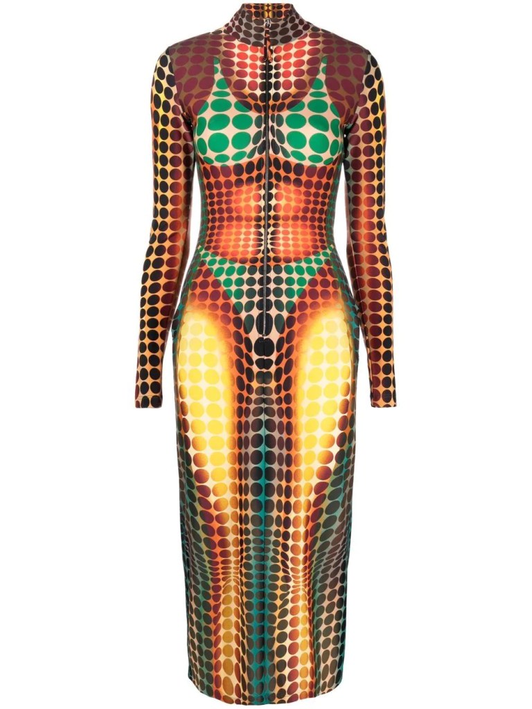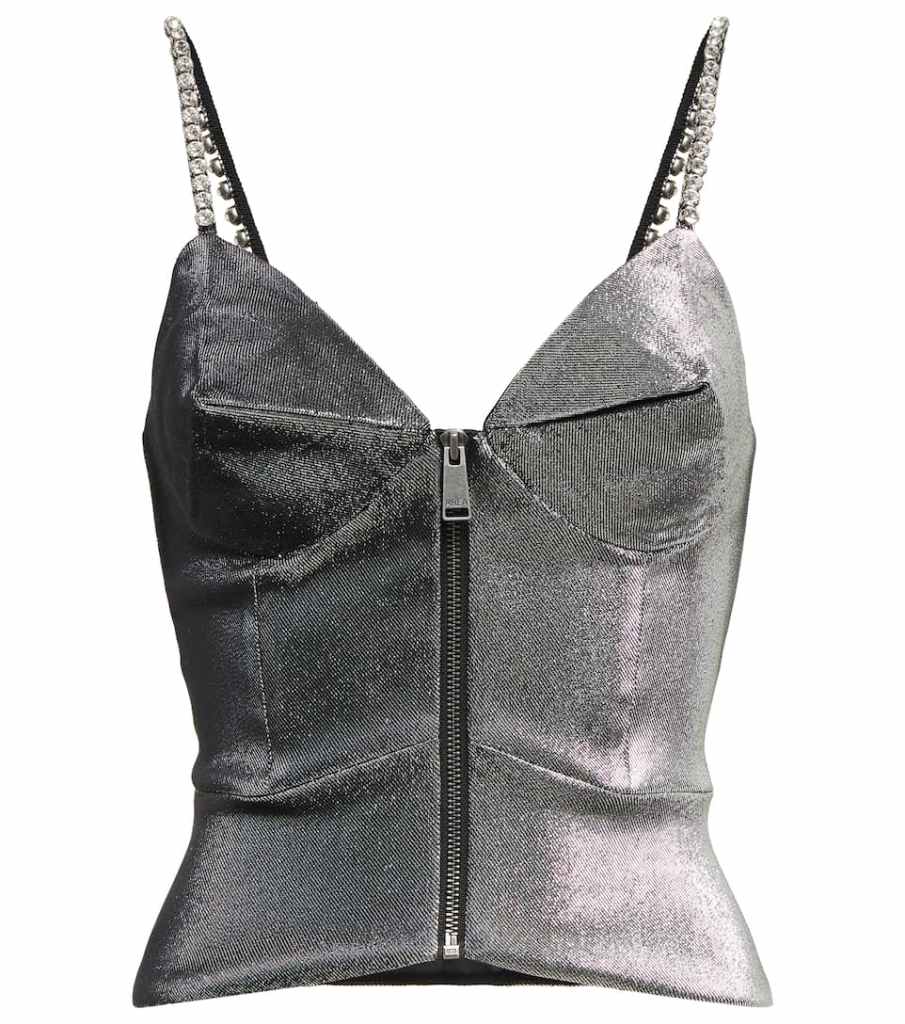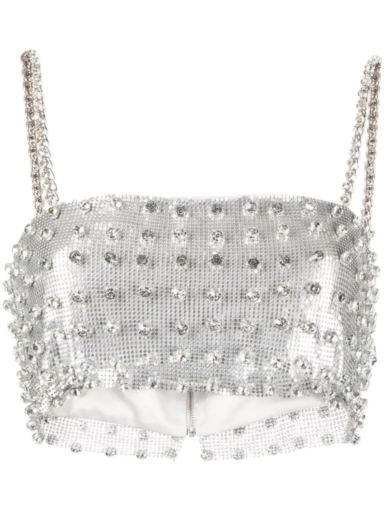 El básico: los destellos. No podemos hablar de noches de disco sin hablar del brillo, y, para resplandecer en la pista de baile, Area tiene esta chaqueta cropped de tweed con hombros estructurados y cristales, o este top corsé metalizado, también adornado con cristales. Self-Portrait, por su parte, tiene este vestido larga de malla con lentejuelas que te lucirá genial si sales en la noche con tus amigas.