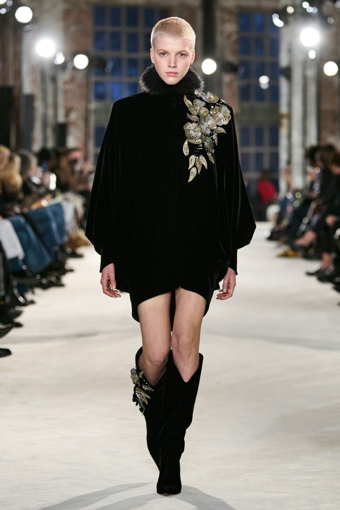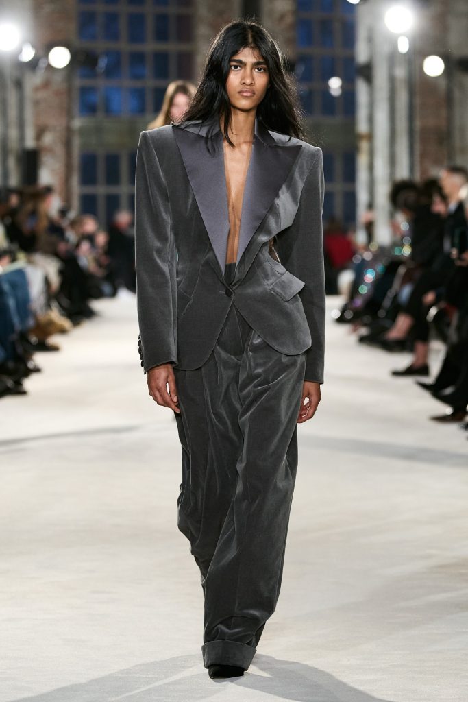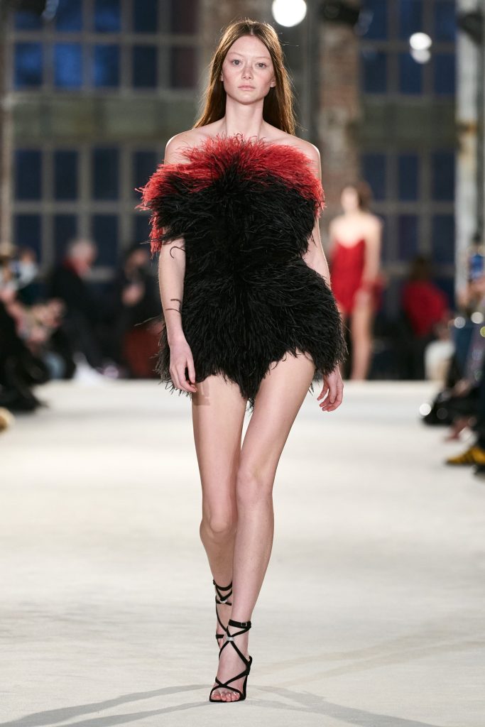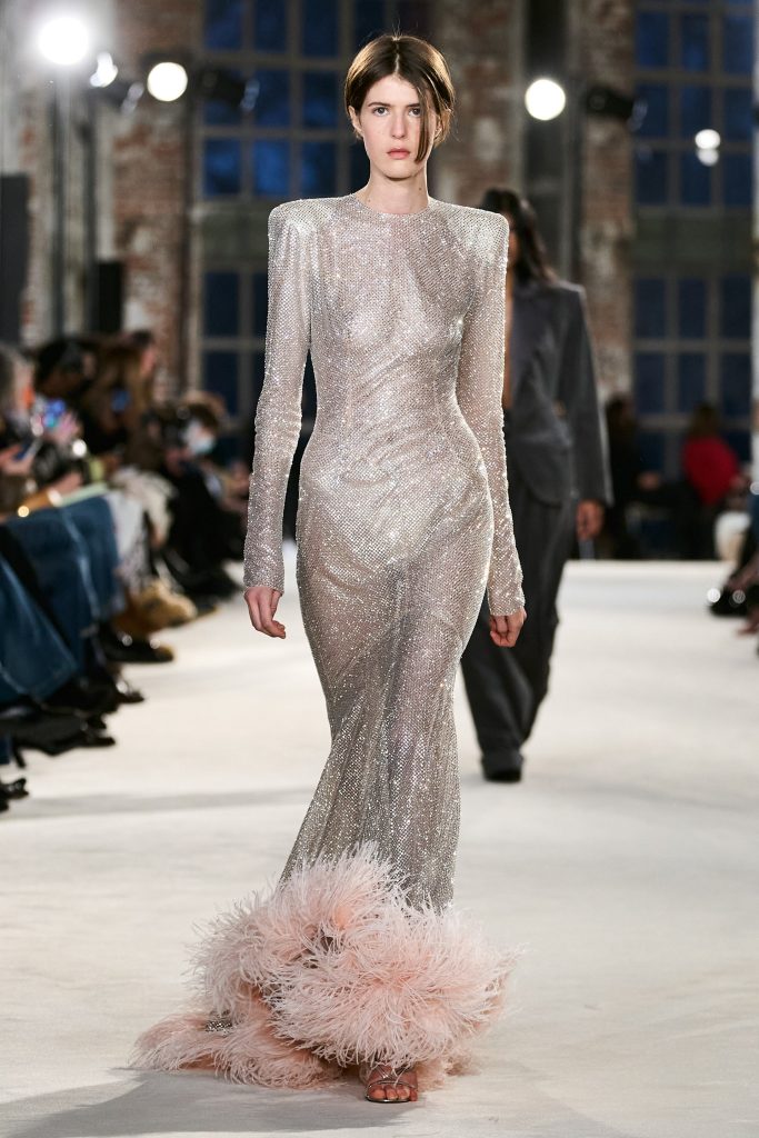 In keeping with Alexandre Vauthier’s DNA, the location was the perfect place for a super chic and exclusive rave (the ultimate party venue!): a warehouse with an industrial aesthetic, exposed brick walls, and huge metal windows. All this created the perfect atmosphere for reflecting Vauthier’s indomitable spirit, something that was reinforced by the electronic music that accompanied the models as they walked the catwalk. Undoubtedly one of the most über chic fashion shows of Haute Couture week. It is this same spirit that we sad reflected in the collection. The garments were a mixture of different eras that have been considered some of the most scandalous, daring and irreverent in history. We saw iconic flapper silhouettes in the silver mini dress with embroidered sparkling sequins and fringe and the look in teal with paillettes, ruffle details on the skirt, and deep V neckline. We saw velvet jackets with pronounced shoulder pads that were characteristic of the 1940s and, finally, maxi dresses full of sequins and feathers that reminded us of the disco era of the 70s. A true mix of festive and celebratory energy.